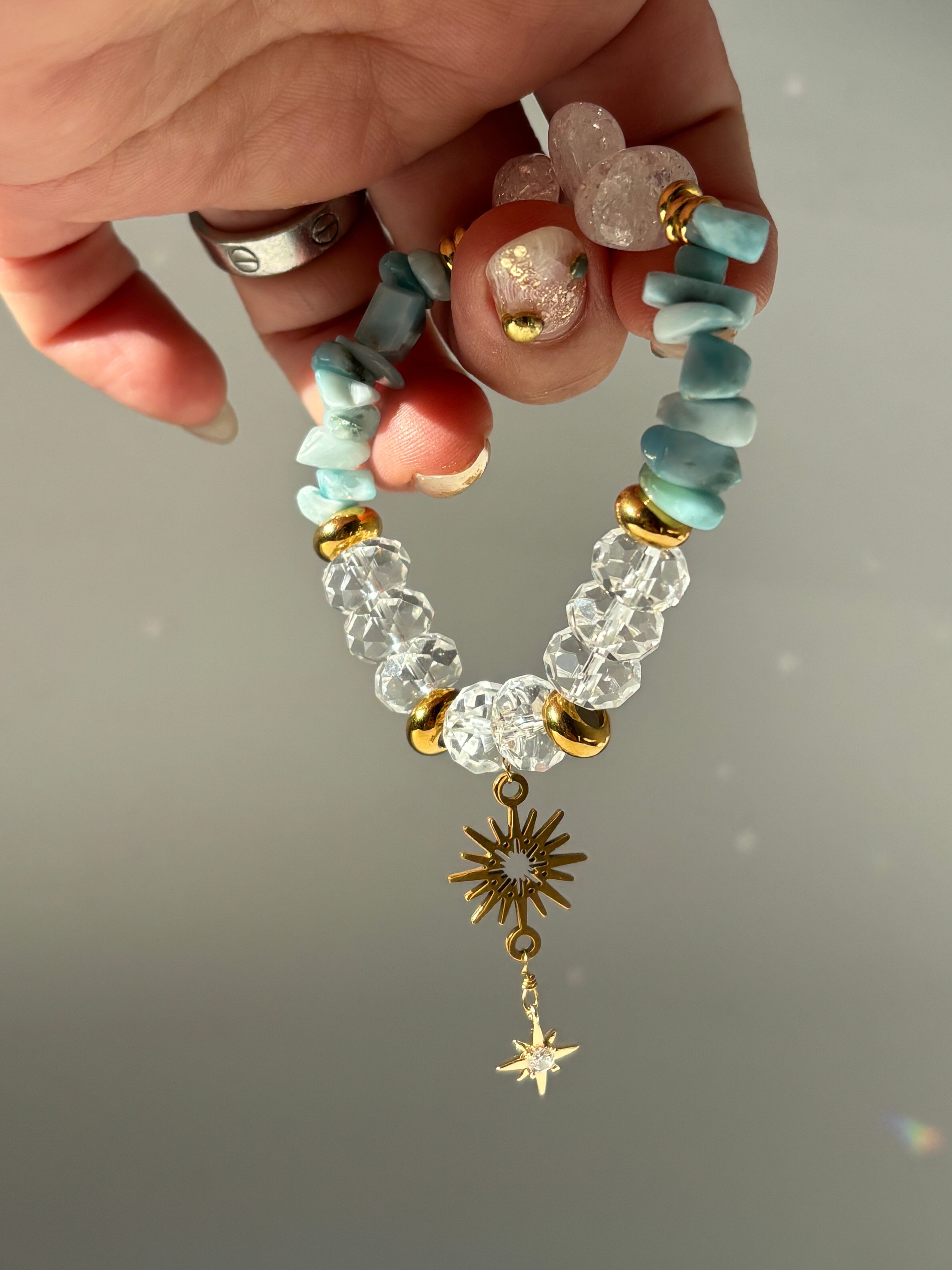 ✧ 運気向上: ラリマーとクリスタルのハーモニーが、ポジティブなエネルギーを引き寄せ、毎日の暮らしに充実感を与えます。