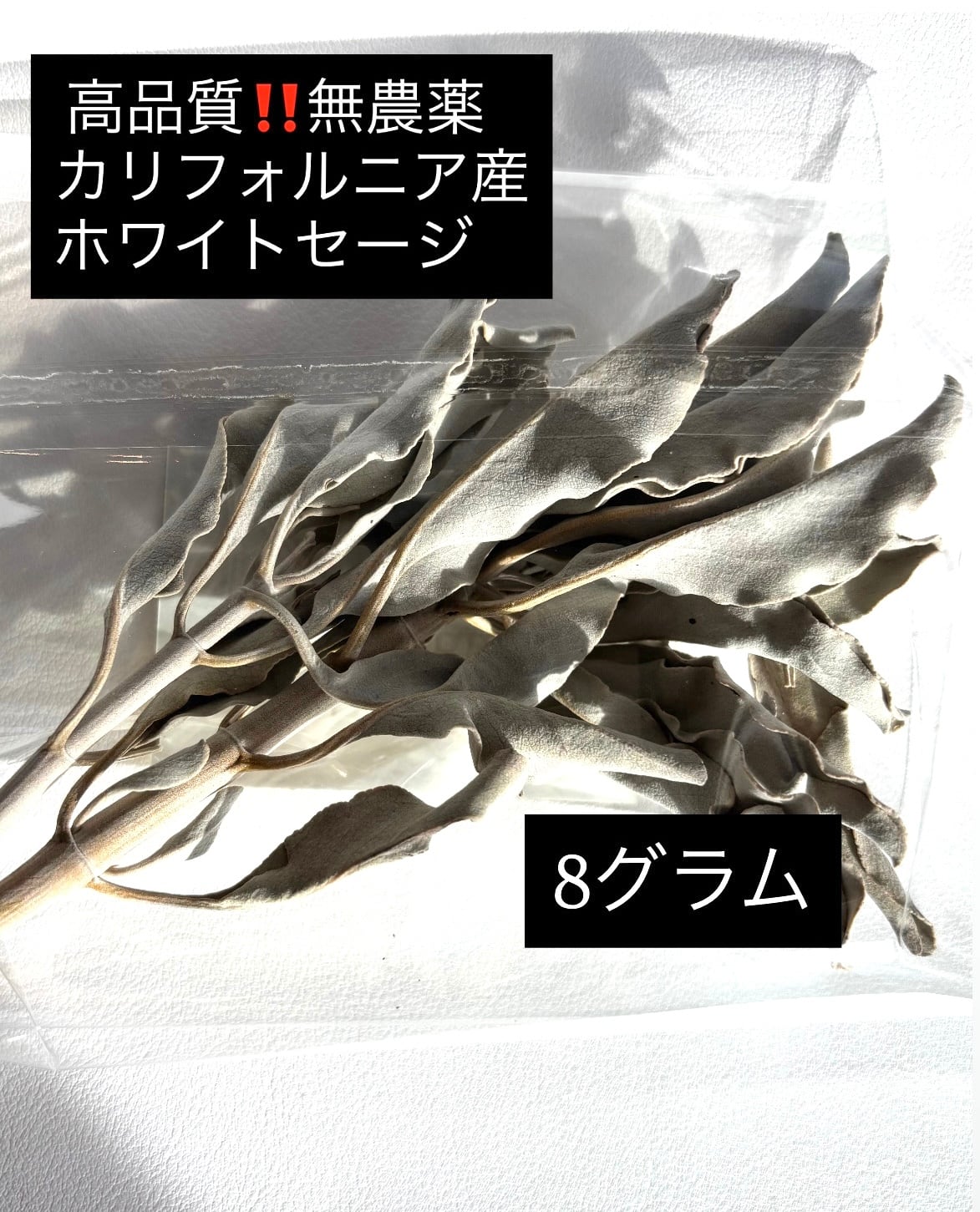 オーガニック ホワイトセージ(8g): 2025年12月下旬収穫。香りの強さと浄化力が際立つ最新ロットです。