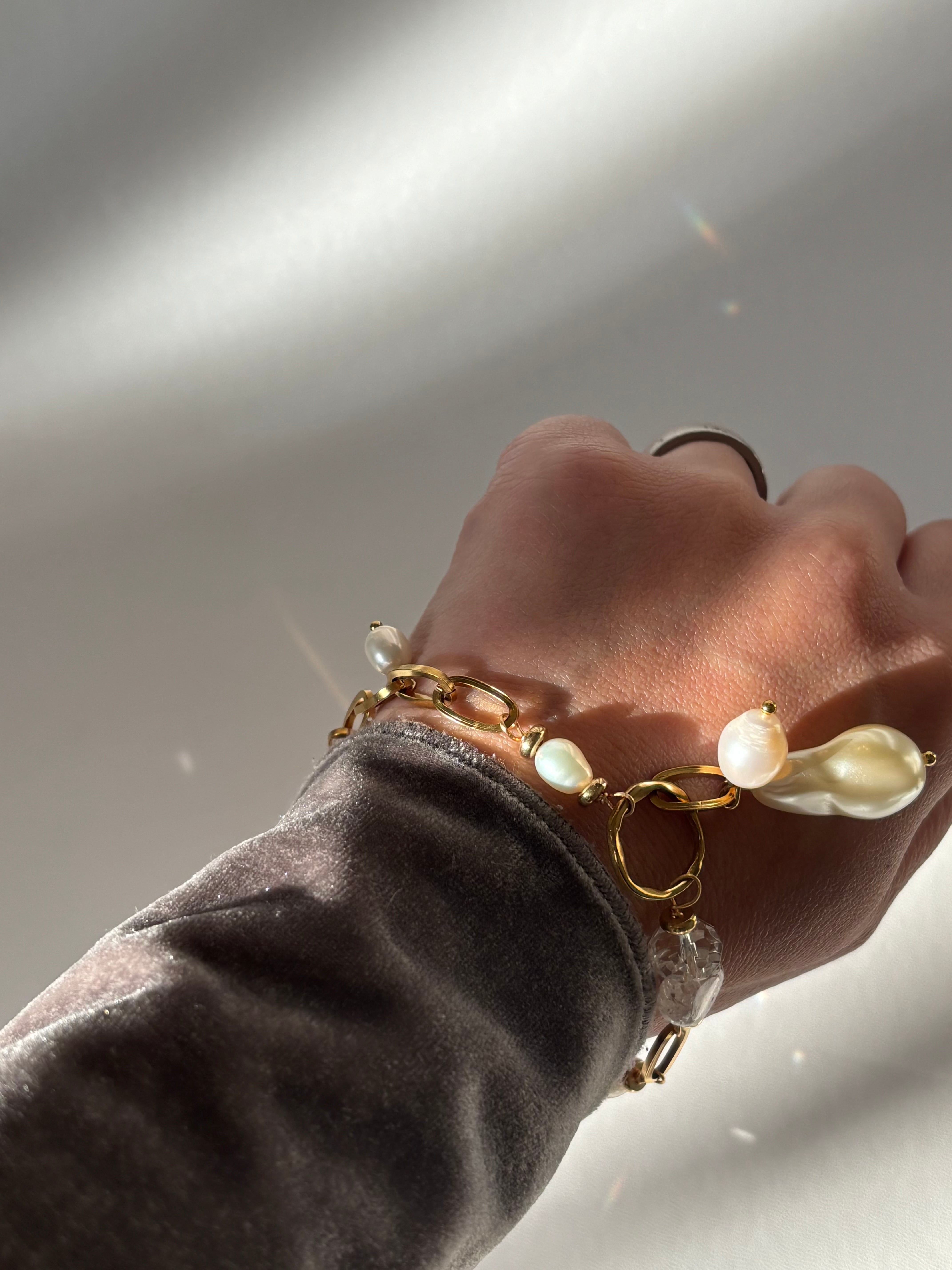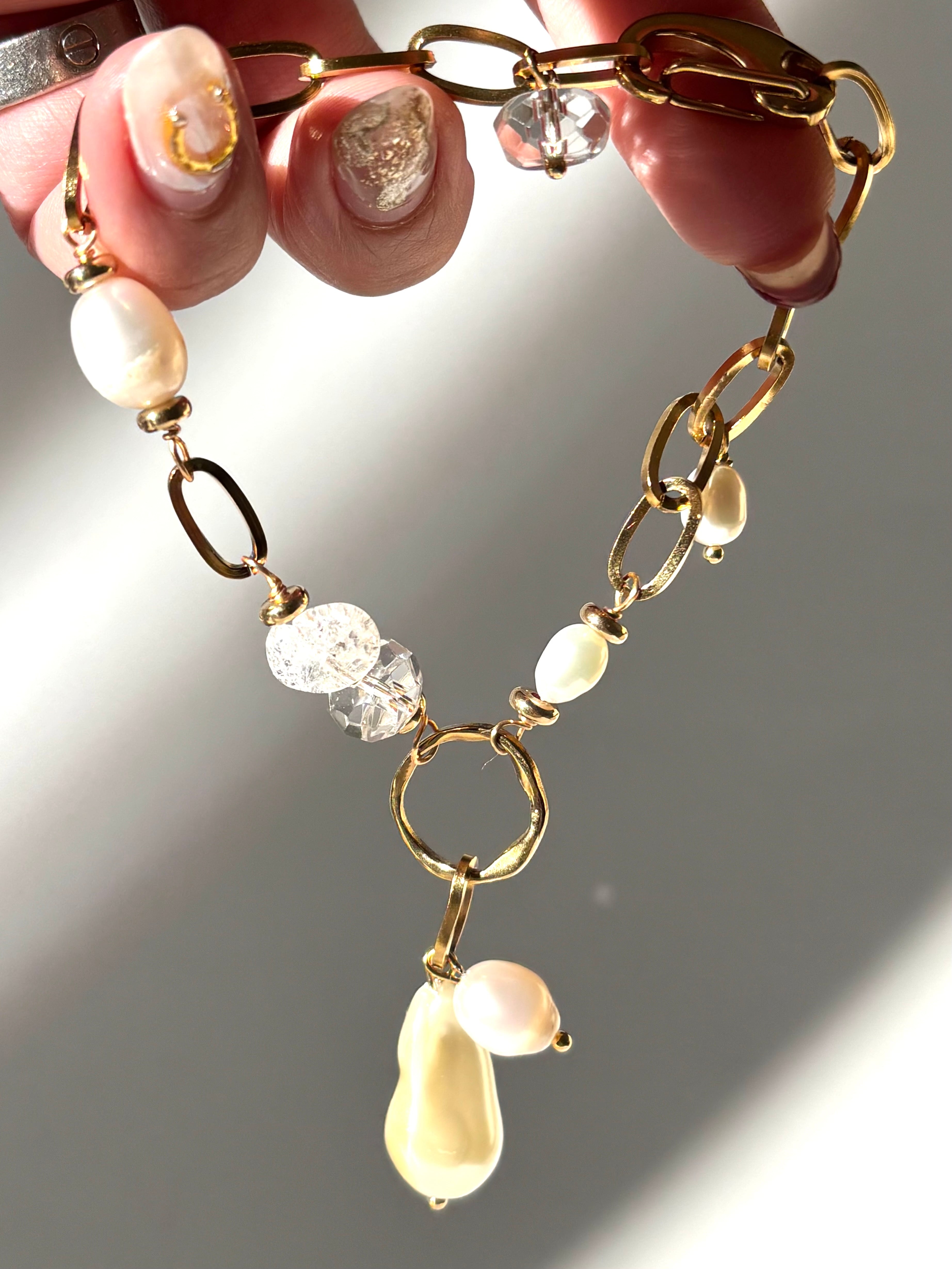 クリスタルの透明感ある輝きは、あなたの周囲を照らし、ポジティブなエネルギーを引き寄せます。淡水パールと共に、心豊かなあなたを引き立てるパートナーとして活躍します!
