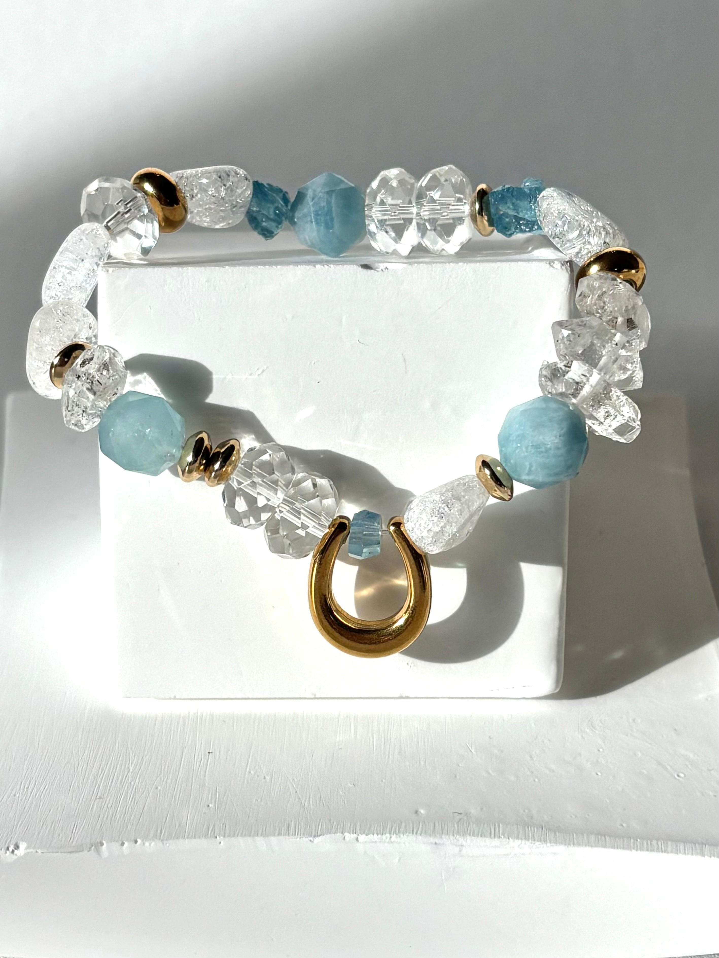 三月限定‼️先行解禁‼️アクアマリン、クリスタル、幸運の器 ホースシューブレスレット ゴールド